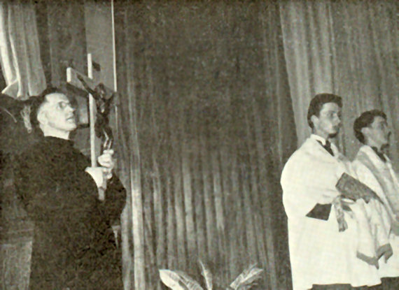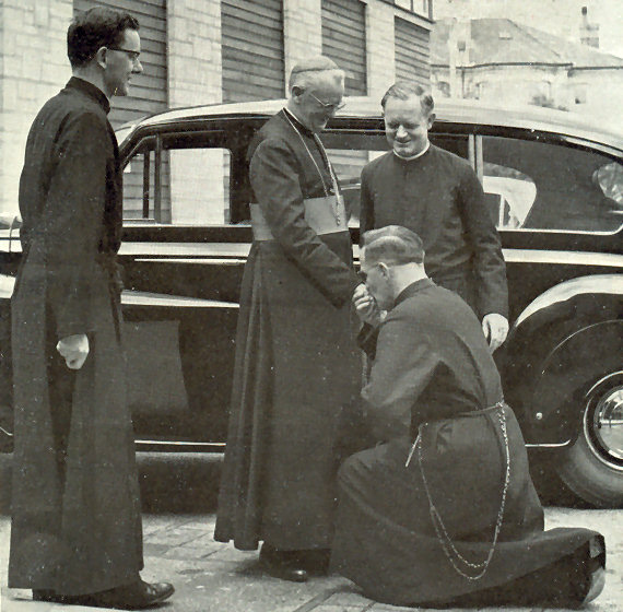 The ceremony began with the procession of the Archbishop from the Music room, where he vested, to the Stage in the Main Assembly Hall. Preceded by Rev. Father Louis, as Master of Ceremonies, the Mitre and Crozier bearers, the Bugia bearer, Thurifer and Boat bearer, a boy with the Metropolitan Cross and Monsignor Bruce Kent, the Archbishop entered the Hall. He was assisted by Revv. Fathers Raymond and Aelred. On arriving at the Stage, His Grace opened the Blessing with a special shortened formula which he had himself approved recently for use in the Archdiocese. A group of boys, representative of the various Forms in the school carried crucifixes which after blessing and incensing would be placed in each classroom. They were led by the Headmaster who bore the main school Crucifix, which when blessed and incensed was placed on the wall of the Assembly Hall. The simple, but affecting ceremony lasted about 20 minutes and then His Grace retired and disrobed. On his return to the Stage, he was introduced by the Clerk to the Board of Governors Councillor B.C.A. Turner. The Mayor of Harrow then spoke of the work being done in the school and the primary virtue of good citizenship which was hot only being taught to the boys but had already been put into effect - one of the past pupils, now a member of the Governing Body, was a local Councillor and another, until he had left the district had served the needs of Harrow too - Councillor Fairley. Councillor Turner who proposed the vote of thanks to His Grace, spoke too of the vast field of endeavour open to boys from a school such as ours and the immense satisfaction to be gained from being of service to the whole community. The presence of the Mayor, whose Catholicity would enhance the noble office to which he was called, should prove an incentive to boys to work always for the common good, which is after all the prime endeavour of a Christian.