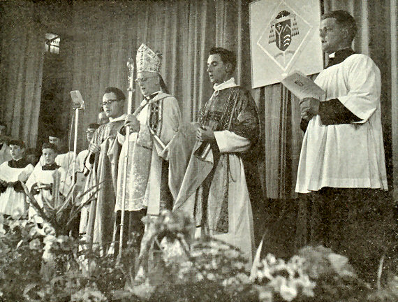 All the invited guests were entertained to tea in the school dining hall where His Grace was able to meet and speak with guests at his leisure. After tea he made a brief inspection of the school and expressed his admiration of the ideas incorporated by the architect, John Strubbe, F.R.I.B.A., and the "non-school" atmosphere of the buildings. On the evening of the same day His Grace presided at the Civic Mass in Saint Joseph's Church, which was attended by all the local Aldermen, Councillors and their ladies. |