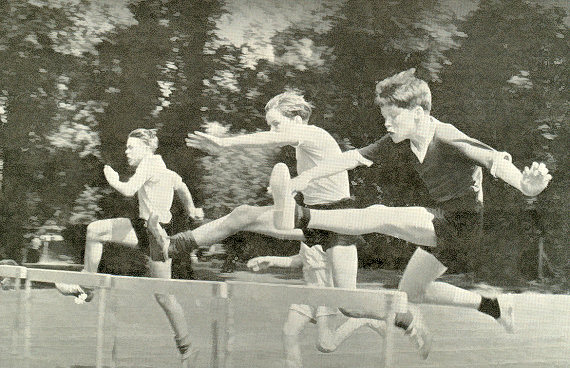 Saturday, 4th July was the day chosen for this year's Sports Day. It turned out to be quite a good choice as far as the weather was concerned, and the programme was completed without interruption. By way of an experiment, it was decided to hold the events in the morning as well as the afternoon, thereby spreading the events and allowing more time. It worked quite well, but it is questionable as to whether this is the ideal answer to the problem of getting through the programme in a reasonable time. This year the hurdles appeared on the programme for the first time, and during the course of the day, nine new records were established, and four existing ones equalled. Of the nine new records, three were on the track, and six in the field events. A complete list of the new records and the names of the winners appears at the end of this report, and whilst these take the limelight, let us not forget the others, without whom there would be no Sports Day and no new records. Space does not permit the printing of their names, but I hope that they will remember that the aim of the sports is to get as many of the boys as possible to participate. To have reached the finals is something to be proud of, and to represent one's House is a further honour indeed - Well done.