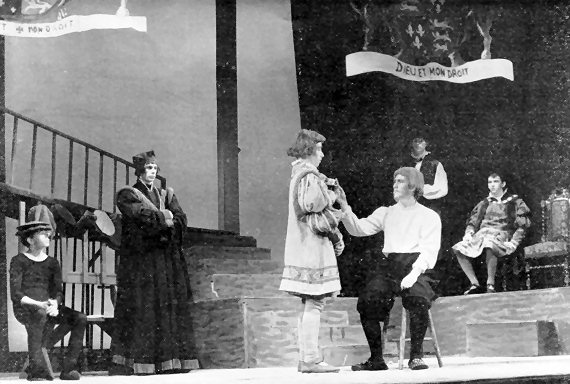 But to undertake such a venture with a society of seasoned actors is one thing; to attempt it with a group of enthusiastic but inexperienced young actors is quite another. Every year fifth or sixth formers from the previous year's play leave the school and new actors must be sought after to replace them. These must be 'broken in', as it were. It is impossible to expect them to act in comedies or even plays set in modern times, as those tend to be much more demanding both from an acting and casting point of view. Historical characters tend to be more remote from the audience than present day characters if only because they represent a remote age. The audience is more alive to flaws in the character of a twentieth century man because he must be portrayed more accurately and precisely than, say a fifteenth century man, because he is, so to speak, one of us. The part of a fifteenth century man can be treated a little more liberally, and with less accent on accuracy to detail, because nobody in the audience is aware of the details of character of such a man. Female parts also present a difficulty, but are quite feasible in an historical play; in a modern play well-night impossible. However, this is all by the way. Robert Bolt wrote, "Man for All Seasons."' - a nice safe historical play about Sir Thomas More; by far the most difficult and certainly the best play yet presented, that is to say, best as far as its authorship was concerned; about the acting I am not qualified to say. It was a great play to act in. No member of the audience, however quick or intelligent, could hope to appreciate it fully, even if he or she came each and every night. There were points in it we were seeing for the first time, at quite an advanced stage in rehearsals. As usual, we began rehearsals well before Christmas. And yet no matter how early we start, there still seems to be so little time to spare at the end. We always wonder if it will ever get off the ground. At first we had little difficulty. Our most unsure moments were up on the rather rickety platform and wooden slope that Mr. Tufnell had erected to "give us the feel of the thing." I remember galloping down there at a mile a minute one time and nearly braining a lad when I knocked off a loose plank.