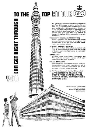 For full details of careers in the Post Office write to: Appointments Branch (TS), Post Office Headquarters, Tenter House, 45 Moorfileds, London, E.C.2. ![]() The 600ft Post Office Tower is used for television and telephone transmissions. ![]() | Advertisers | 1968 Magazine Index | HOME | |