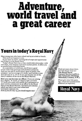 more nuclear power. It offers you and assured and rewarding future.![]() As a specialist or technician, you'll have a good secure trade with good pay and excellent prospects. And you can add in world travel, sport in plenty, fine company - and an average of 6 weeks paid holiday a year. You can join at 15. Or at 16 you can become one of the Navy's soldiers of the sea in the Royal Marines. ![]() How you can become an officer. If you are aiming for a degree, 'A' levels, or expect to get 5 or more 'O' levels you could well qualify for a permanent or short service commission as an officer in the Royal Navy or the Royal Marines. And there are schemes which can help to pay your school and University expenses too. Even if you are only 14, you should enquire now! ![]() Find out more about them. For full details write to - The Royal Naval Careers Service (25OL1), Old Admiralty Building, Whitehall, London, S.W.1. Please give your full name, age, school and qualifications achieved (or expected). ![]() | Advertisers | 1968 Magazine Index | HOME | |
