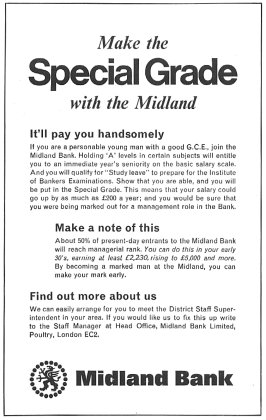 It'll pay you handsomely If you are a personable young man with a good G.C.E., join the Midland Bank. Holding "A" levels in certain subjects will entitle to an immediate year's seniority on the basic salary scale. And you will qualify for "Study leave" to prepare for the Institute of Bankers Examinations. Show that you are able, and you will be put in the Special Grade. This means that your salary could go up by as much as £200 a year; and you would be sure that you were being marked out for a management role in the Bank.