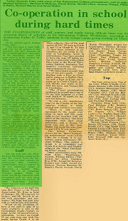 “Co-operation has been the recurring theme of all school activity during the year. The swift co-operation of the staff in coping with extra pressure: the very high percentage of co-operation of parents with the recommendation of staff at 27 parent/teacher meetings in the course of the year: the co-operation of the pupils, not only in the academic sphere, but in the manifold areas of interest, athletic and cultural, which go to form the sum of education.