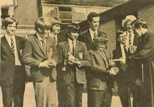Father Dominic with some of the Salvatorian College prizewinners. Left to right: Michael Anderson, Michael O'Mahony, David Burke, Neville Chan, Jeremy Thorpe, Philip O'Reilly, Richard Martin & David Walsh.