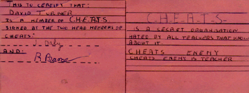 ![]() I'm almost too embarrassed to allow this to be included! It's our C.H.E.A.T.S. Club Membership Card from our first year at Salvatorian. Signed by Richard Pearce and John Daly; I'm sure they'll thank me for this. Who else is willing to admit they were in the club.